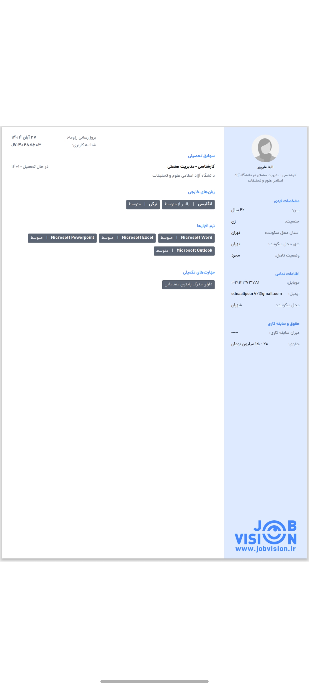 elinaalipour942 دانلود CV دعوت لیست کوتاه درباره کارجو اشتراک گذاری در فیس بوک توییتر پینتریست موقعیت مکانی نمونه کار اولین کسی باشید که دیدگاهی می نویسید “elinaalipour942” لغو پاسخ امتیاز شما برای این لیست امتیاز شما نام ایمیل ذخیره نام، ایمیل و وبسایت من در مرورگر برای زمانی که دوباره دیدگاهی مینویسم. دیدگاه شما